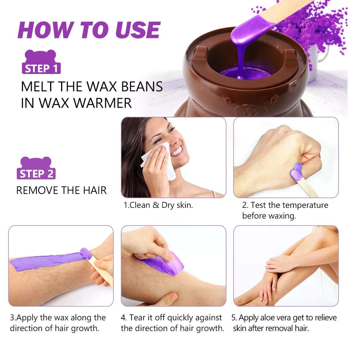 - Easy To Use : Place the pellet wax face into the wax heater of your choice. Heat the wax to a working temperature. Using a spatula, spread a layer of pellet hot wax onto the area to be treated in the direction of the hair growth. Allow 30 to 40 seconds to cool and holding the skin taut remove the wax with a firm action against the direction of the hair growth. Please test before use, do not continue to use for skin allergies. Do not use when the skin is injured.